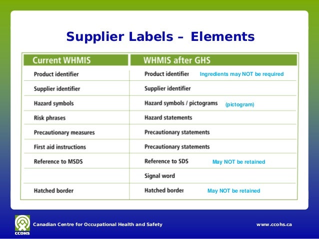 PDF Classification and Labelling of Chemicals (GHS) for Canadian Workplaces ... See the WHMIS 2015 Hazard Classes Fact Sheet for more information. Supplier Labels Supplier labels have a few new requirements. Most of the label elements are standardized. Most hazard classes and categories have a prescribed signal word, hazard statements, pictogram(s), and precautionary statement(s). Supplier labels continue to be