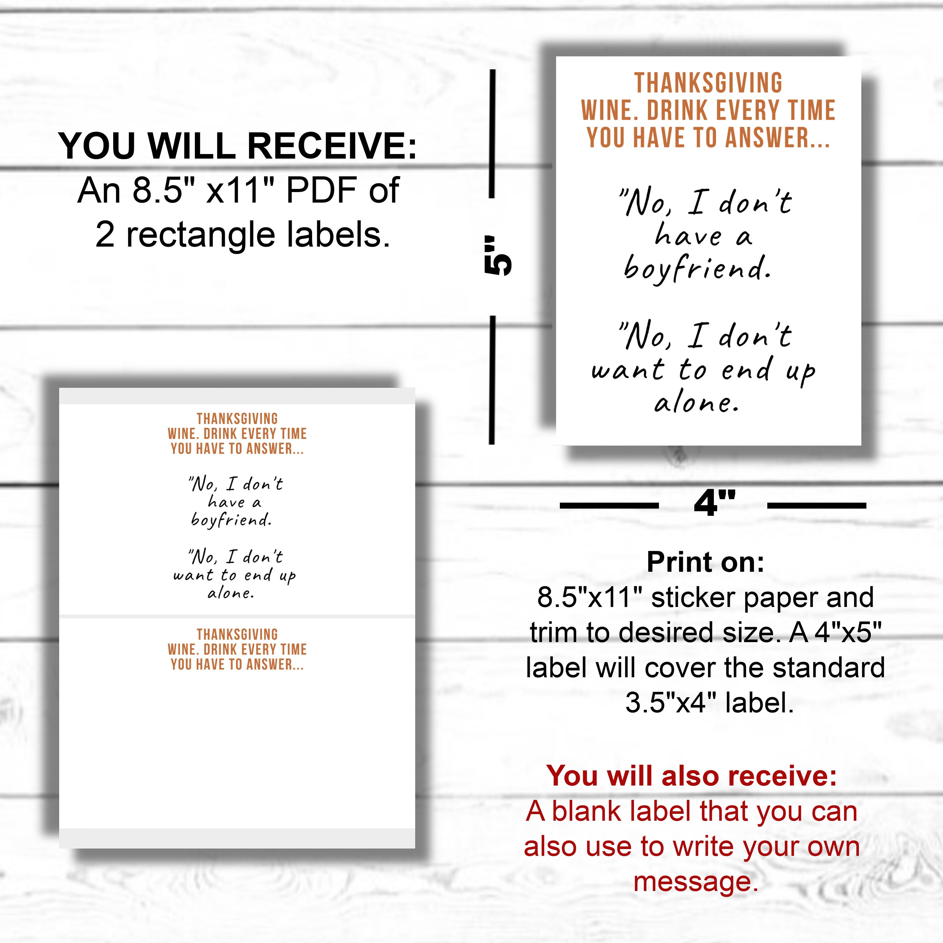 The Best Christmas Wine Labels for Spreading Festive Cheer Step 1: Obtain The File. Simply download the file, which is delivered immediately to your email inbox. I recommend printing onto matte photo paper for a nice clean finish. You can follow the links here for each of the sets. Santa & Rudolf. Gingerbread Man & Snowman. Free DIY Wine Label Templates for Any Occasion - The Spruce Crafts There are 12 different holiday wine label designs here, so you have plenty to choose from. Better Homes & Gardens also has some free fall wine labels that include fall, Thanksgiving, and Halloween designs. Free Wine Labels for the Holidays from Better Homes & Gardens Continue to 9 of 9 below. 09 of 09 Modern Wine Label Martha Stewart Weddings Free Thanksgiving printable wine label | Funny christmas tags, Free ... "This listing includes 4 labels exactly as shown *Label dimensions: 3 1/2\" x 5\" Your labels will ship within 2 business days. Please contact me if you require special shipping arrangements (Additional charges may apply). All wine labels are printed using a high quality digital print press. Color Standards... Thanksgiving Party & Printables | Thanksgiving Wine Labels & Hostess Gifts Printable Thanksgiving Wine Tags (Instant Download) $4.00 > Order Now! Thanksgiving Travel Custom Bag Tags $12.00 > Order Now! Talk Turkey Thanksgiving Disposable Mask Set $18.00 > Order Now! Custom Thanksgiving Mini Wine Labels $9.95 > Order Now! Give Thanks Disposable Thanksgiving Face Masks $3.00 > Order Now!